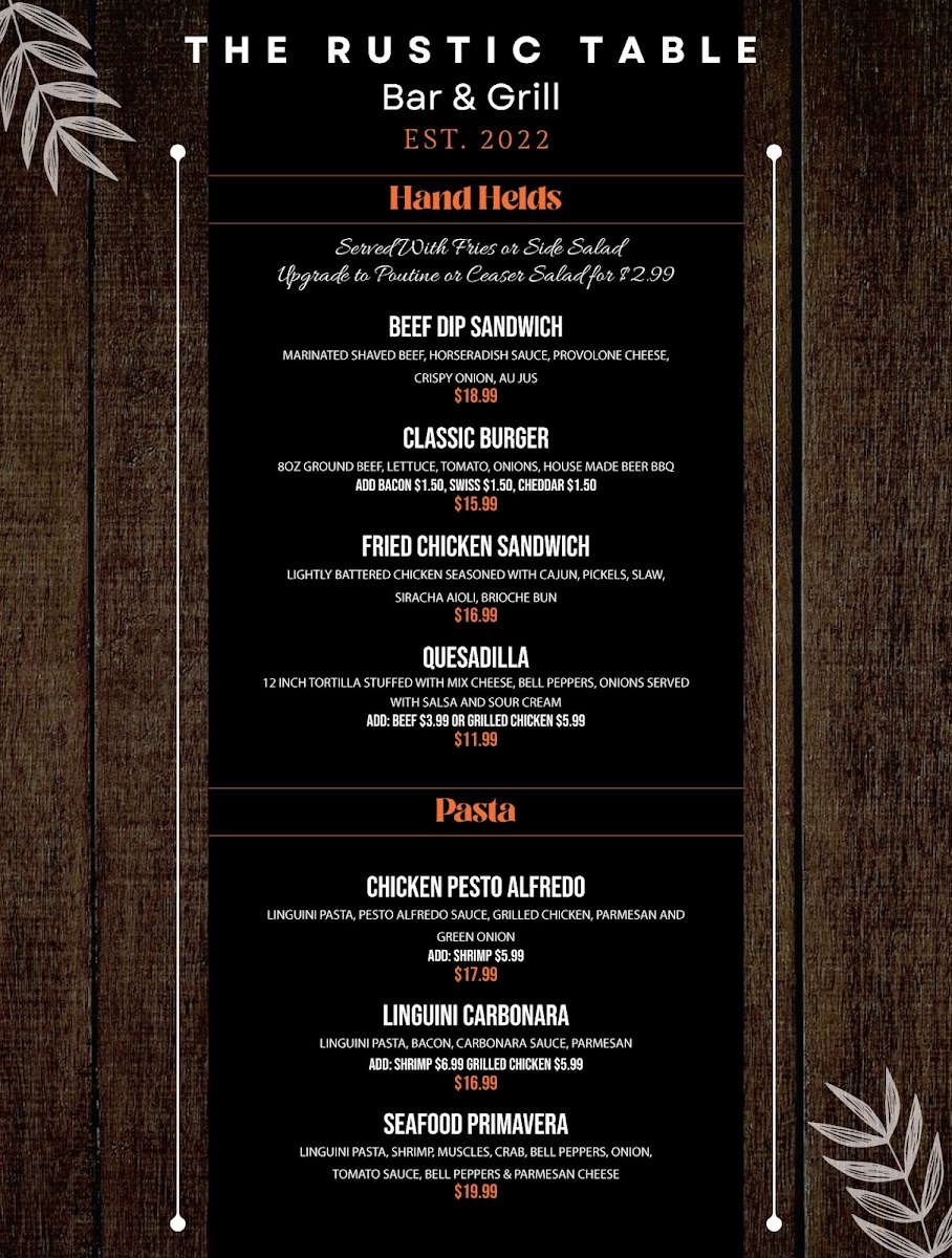 Welcome to The Rustic Table Bar & Grill, a culinary gem located at 13039 Tecumseh Rd E, Windsor, ON. This charming eatery brings together a vibrant tapestry of flavors, with a menu that invites both exploration and comfort.